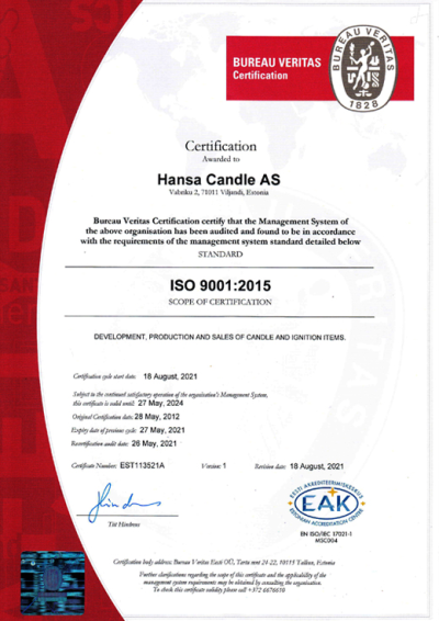 AS Hansa Candle was founded in 1996. We produce candles and ignition products. From the very outset we have prioritised high quality, long-term client relations and environmentally-friendly production. By adhering to these three goals our company has evolved into the largest candle maker in the Scandinavia and Baltic States. Our products are currently exported to 15 countries. The company factory is located in the Estonian city of Viljandi. The total area of the roofed production facilities exceeds 20,000 m2. We now have over 140 employees. Our annual production output of tealight candles is more than half a billion. We have invested into new production lines and can make various candles both from natural raw materials and the traditional candle base – paraffin.