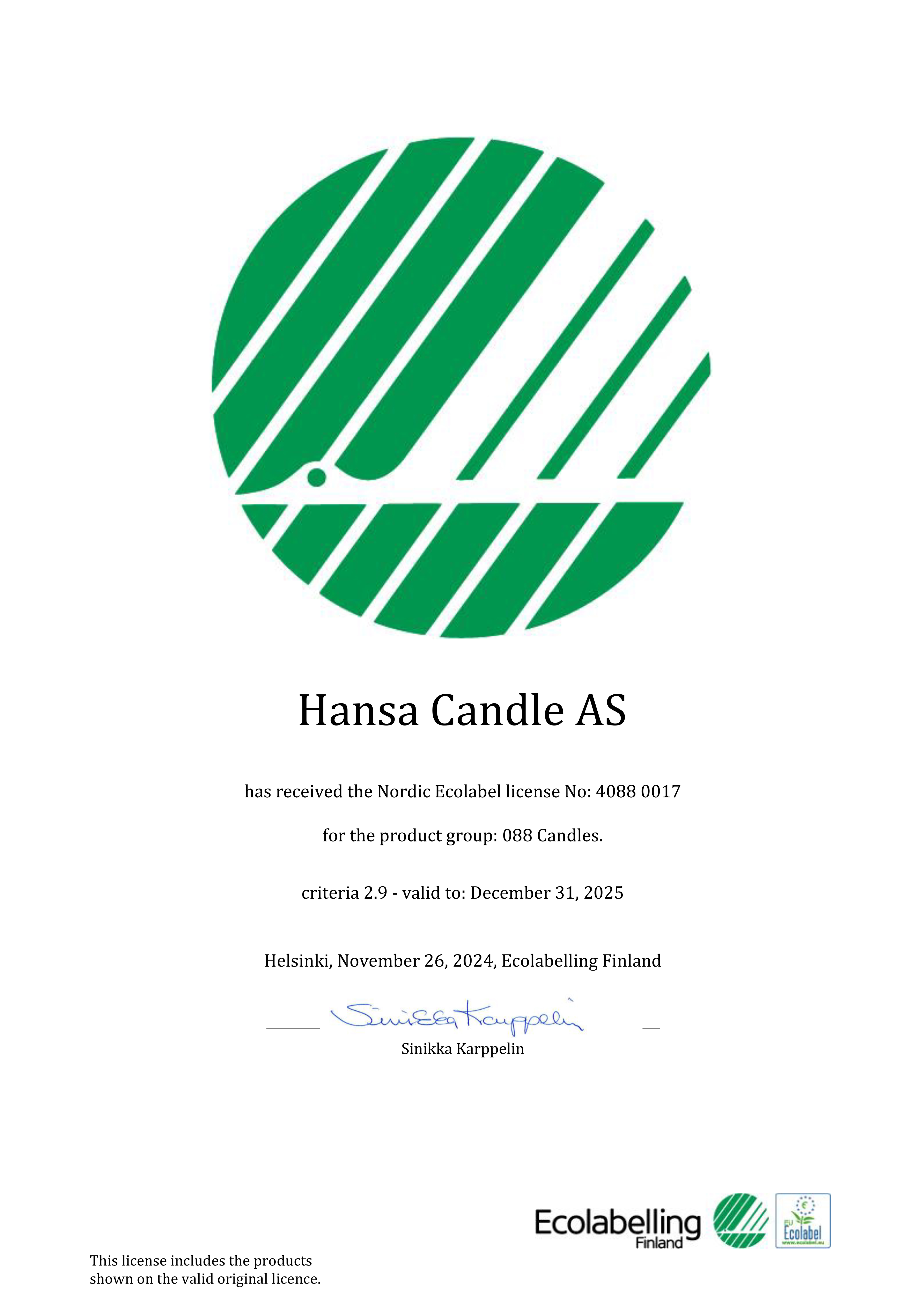 AS Hansa Candle toodete valmistamisel kasutatakse RSPO sertifitseeritud palmivaha.